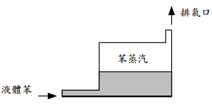 【已刪除】四、苯的儲槽示意如下圖,在室溫下(20°C),當泵入每分鐘 10 公斤的液體苯進入儲 槽時,計算由排氣口,散逸到大氣中氣體苯的流量(公斤/分鐘)。(20 分) *假設氣體苯是理想氣體,在 20°C的蒸汽壓為 0.0987 atm,液體苯密度為 0.865 g/cm