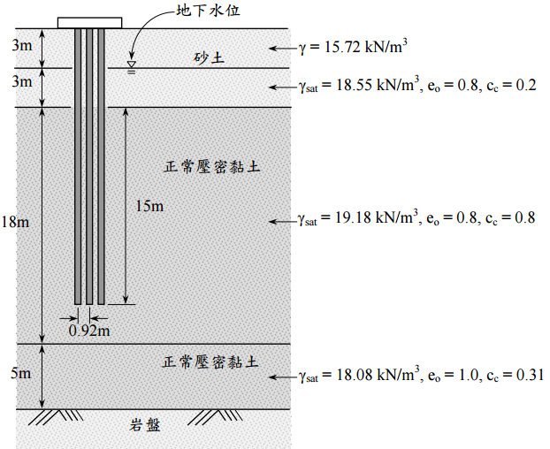 【已刪除】四、如圖所示為 3 × 3 群樁布置之剖面示意圖,該群樁需承載上部結構傳下來之垂直載 重為 1500 kN,圖中列出各土層之相關性質。群樁中每一支基樁之外徑為 460 mm, 基樁中心距為 920 mm。試計算此群樁之壓密沈陷量。(25 分)