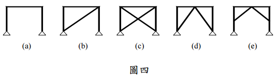 【已刪除】六、圖四(a)~(e)所示構架因遭受地震側向位移損害需予以補強,試就補強觀念,假設沒 有地坪繫梁,構材 E、A、I 值均等之剛構架及斜撐系統,補強效果何者較佳(即在 水平地震力作用下,屋頂位移最小)?(10 分)