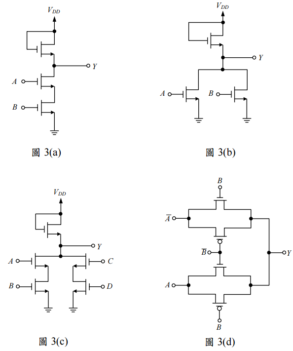 五、如圖 3(a)-(d)所示之數位邏輯電路,其中 A, B, C, D 為輸入,輸出為 Y,試寫出其布 林函數。(20 分)