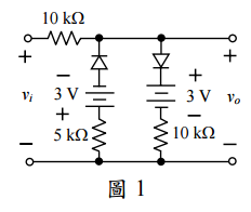 一、如圖 1 所示電路,假設二極體為理想二極體,試繪出其電路轉換特性。(20 分)