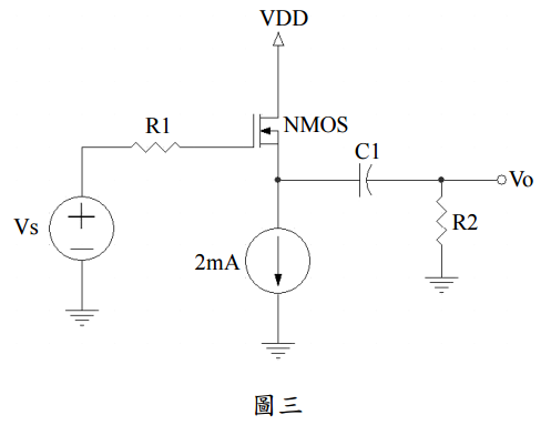 三、如圖三所示電路,其中 µnCox W/L=1.5 mA/V