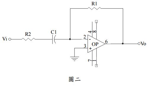 二、如圖二所示電路,OP 為理想之運算放大器,其中 R1=50 kΩ,R2=2 kΩ,假設 3 dB 頻率為 2 kHz,求出其轉換函數(transfer function)Vo/Vi=?其高頻增益 (high frequency gain)為何?求 C1=?(20 分)