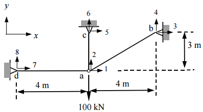 【已刪除】四、如圖示三支構件之桁架(truss)系統,受向下 100 kN之作用力。試以矩陣直接勁度 法(direct stiffness method)分析a點之水平變位d