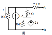 【已刪除】一、如圖一電路所示,求 A、B 兩端之諾頓 等效電路(Norton equivalent circuit)。 (20 分)