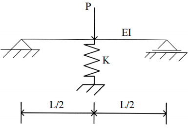 【已刪除】四、如圖所示之一簡支梁,梁長 L,梁跨中央有一彈簧常數 K 支承,梁跨中央受一集中載重 P 作用,已知彈簧常數 K 為零時,梁跨中央之變位