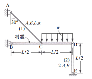 【已刪除】二、在圖中之結構,桿件 BCD 為剛體,鐵線 AC 之截面積為 A,楊氏模數為 E,熱膨脹 係數為 α,鐵線 AC 受冷卻使溫度下降 ∆T;桿件 DE 之長度為 L / 2,截面積為 2 A, 楊氏模數為 E。求在均佈載重 w 作用下,鐵線 AC 及桿件 DE 之內力。(20 分)