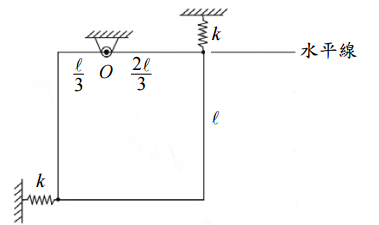 的均勻剛性薄板對如圖所示之靜力平衡位置有一微小的振動,重力的方 向為垂直向下,試求該微小振動的自然頻率。(20 分)
