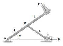 【已刪除】一、如圖所示之作用力 P 與 B 點之距離為 L,其作用方向係與桿件垂直,AB 段與 BC 段 之長度亦均為 L,試以虛功原理求在此位置時之水平力 F 以維持靜力平衡。(20 分)