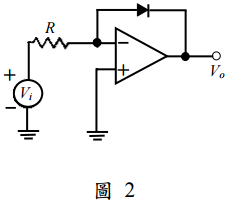 【已刪除】二、圖 2 為運用理想運算放大器(Ideal Operational Amplifier)與 PN 接面二極體(PN Junction Diode)設計成之對數放大器(Logarithmic Amplifier),其中二極體之反向 飽和電流(Reverse Saturation Current)為I