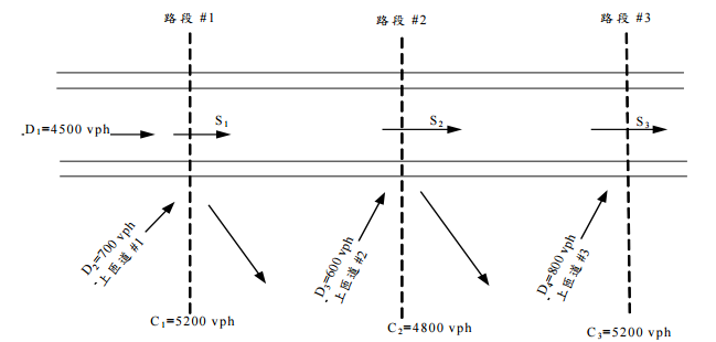 【已刪除】五、若有一高速公路路段欲實施入口匝道儀控,其相關交通特性資料如下圖所示,請分 別求算三個上匝道路段之儀控率。(15 分)另此類儀控率之計算,往往可透過線性 規劃模式予以求解,請寫出此問題之線性規劃模式。(10 分)