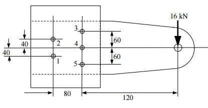 【已刪除】三、如下圖所示,利用 5 根鉚釘(16 mm 直徑)搭接的兩塊鋼板。兩鋼板厚度均為 10 mm,主鋼板承受 16 kN 負荷,試求鉚釘所承受的最大剪應力(20 分)與承面應 力(bearing stress)。(5 分)(尺寸單位:mm)