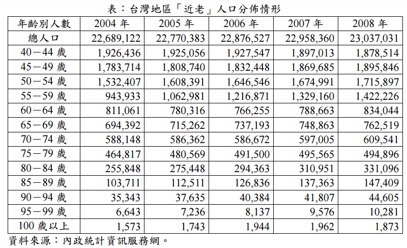 【已刪除】三、下表為台灣地區 40 歲以上的人口分佈情形,請就表格裡年齡組別人數的變遷趨勢 做綜合性的分析,並且延伸至福利意含與服務網絡的範疇討論?(25 分)