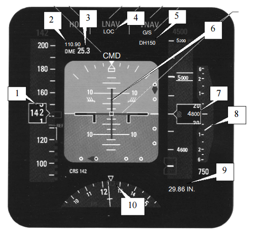四、下圖為現代航電系統的主要飛航指示顯示器(Primary flight display, PFD),請依據 標示的數字順序(1~10),指出它的功能名稱或指示意義。(文字意義必須符合, 用詞上的些微差異不會扣分)(30 分)