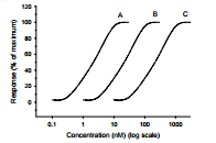 75. 120 A B C Response (% of maximum) 100 80 60 40 20 0 0.1 1 10 100 1000 Concentration (nM) (log scale) 上圖為三種作用劑 (agonists)A、B、C 的濃度反應曲線(concentration-response curves), A、B、C 的藥效強弱順序為何?