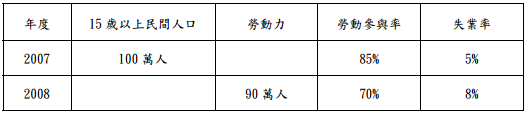 14. 以下為某國 2007 與 2008 年之人口及就業相關資料,請問 2007 到 2008 年該國就業人口之變動為 (計算時四捨五入取整數):