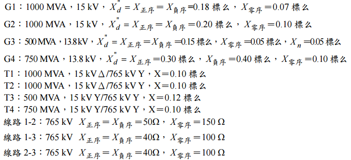 【已刪除】四、圖四顯示三相電力系統的單線圖。在 3 號發電機的中性點連接一個電感器 0.05 標么。忽略Δ-Y 變壓器相位移。選擇基值位於線路 1-2 區域,其電壓基值為 765 kV,且系統容量基值為 1000 MVA。 請以標么(Per-Unit)阻抗的數值,畫出正序阻抗網路圖、負序阻抗網路圖、零序阻抗網路圖。 已知的資料如下所述:(20 分)
