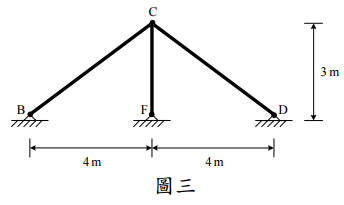 【已刪除】三、有一桁架如圖三所示,桿件之 AE 均為 25000 kN,若 B 點下陷 1.5 cm,試求各桿之 桿力。(25 分)