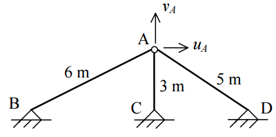 【已刪除】四、考慮圖示之桁架,若以勁度法表示其平衡方程式,可寫為[K]{U}={P},其中{U}為 位移向量,依序包括uA及vA兩個自由度。[K]為結構勁度矩陣,{P}為外力向量。若 已知楊氏係數E=200 GPa,熱膨脹係數α=10