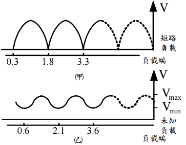 圖二 傳輸線分別於負載端接(甲)短路及(乙)未知負載時,其電壓量測結果