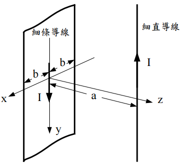 【已刪除】四、沿 y-軸之二平行長導線,如圖四所示,其中細條導線之寬度為 2b,與細直導線距離 為 a,細條導線上之電流 I 均勻分布,且與細直導線上之電流大小相同但方向相反, 細條導線之厚度及細直導線之線徑均忽略不計,推導此二平行長導線單位長度之相 互作用力表示式,並說明該作用力為吸引力或排斥力。(20 分)