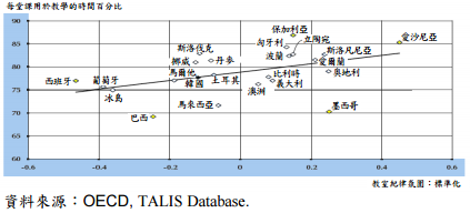 【已刪除】四、下圖橫軸為教室紀律氛圍標準化分數,平均數為 0,標準差為 1;負數代表教室紀律 氛圍在國際平均之下。縱軸為教師每堂課用於教學的時間百分比,從 60%至 90%。 請說明斜線代表的意義,並分析墨西哥、巴西、西班牙、愛沙尼亞與保加利亞之教 師教學與教室紀律氛圍的關係。韓國的 PISA(The Program for International Student Assessment)成績表現不凡,請對照韓國(黑點標示)在此圖中的位置,條列出韓國 值得進一步研究的比較教育議題。(25 分)