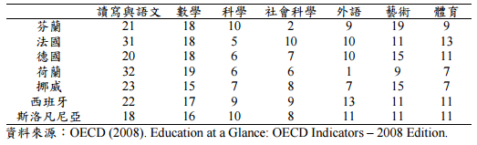 【已刪除】三、下表為七個國家 9 歲至 11 歲主要課程授課時間百分比。請分析七國主要課程授課 時間的安排,找出共同之處,並進一步申論我國課程改革應注意之事項。(25 分)