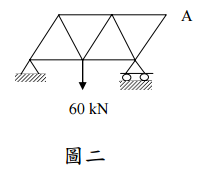 【已刪除】二、設有如圖二所示之桁架,簡支跨度中點受力 60 kN。設此桁架各桿件長度均為L,且各 桿件之斷面均勻,軸向剛度EA為常數。試求此桁架右上端A點之垂直變位δ