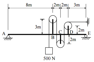 【已刪除】一、圖中滑輪與繩索系統最左端懸吊一重量為 500 N 之重物,A 點為鉸支承,E 點為滾 支承,試計算梁支承 A 點與 E 點之反力。(25 分)