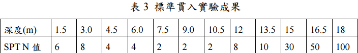 【已刪除】三、有一工址地表至地表下 3 m為砂土組成,地下 3 m以下至地下 14 m以內皆為黏土組 成,15 m以下則為風化透水岩盤,地下水位位於地表,現地進行標準貫入實驗,成 果如下表 3 所示,請說明標準貫入實驗的作法,黏土之不排水剪力強度可以用下式 估算,Cu(kN/m