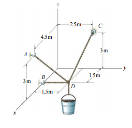 【已刪除】一、如下圖所示,各點座標位置 A(4.5, 0.0, 3.0),B(1.5, 0.0, 0.0),C(0.0, 2.5, 3.0), D(1.5, 1.5, 0.0),若桶重 200 N,試求繩子 DA,DB 及 DC 之張力各為若干?(20 分)
