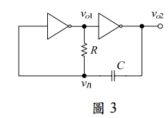 四、如 圖 3 所 示 為 一 以 二 個 CMOS 反 相 器 所 組 成 之 無 穩 態 多 諧 振 盪 器 ( Astable multivibrator),試畫出v