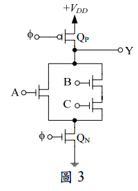 【已刪除】四、如圖 3 所示為一動態邏輯閘,其中φ為控制信號,A、B 與 C 為輸入接腳,Y 為輸出 接腳,試寫出其布林函數(5 分),並說明控制信號φ在高電位與低電位時的功能為 何?(5 分)請分別畫出一布林函數為