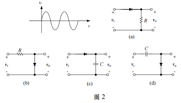 二、如圖 2(a)-(d)所示的電路,假設二極體導通時的順向壓降為 0.7 V,輸入信號v