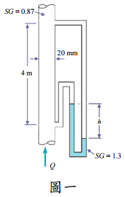 /s 之速度流 經圖一所示的垂直圓管,試決定液體壓力計的讀數h。水之比重量γw=9.81 KN/m3 。( 20 分)