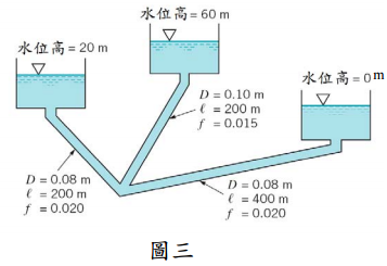 【已刪除】三、三個裝滿水的儲水槽由三根圓管連接,如圖三所示。假設次要損失均予以忽略,試 決定每一根圓管的水流率。圖中 D 為圓管直徑,