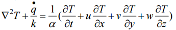 其中 u、v、w 分別為 x、y、z 方向之流體速度,T 為溫度,t 為時間,k 為熱傳導係 數, • q為單位體積熱產生速率, ∇