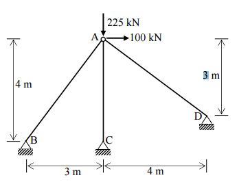 【已刪除】四、如圖所示之桁架結構,其三個支承點 B、C、D 均為鉸支承,且 A 點承受一垂直向下 載重 225 kN 及一水平向右載重 100 kN。假設各桿件之彈性模數與斷面積乘積均為常 數值 EA = 10000 kN,請以直接勁度法(direct stiffness method)計算 A 點之水平變位 與垂直變位,並解出桿件 BA 之軸力。(若以其他方法計算不予計分)(25 分)