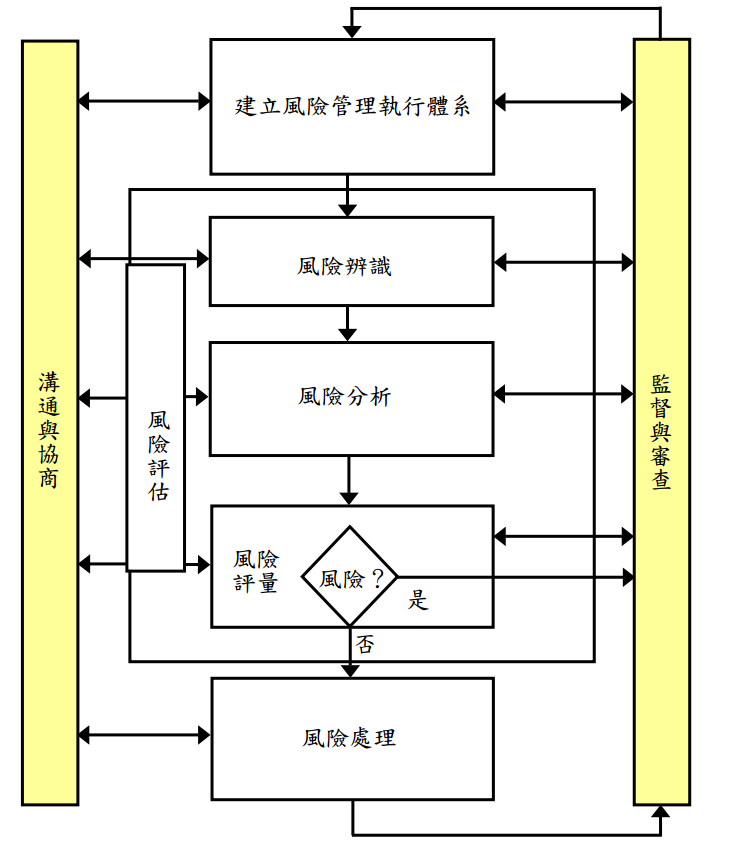 【已刪除】一、行政院研究發展考核委員會出版之風險管理手冊中,描述風險管理之架構如下圖 所示。請說明「風險管理」之意義,以及風險管理程序中「風險辨識」、「風險分 析」、「風險評估」與「風險處理」之意義。(25 分)