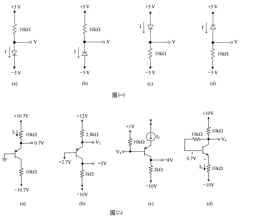 四、設電晶體β為無限大,求圖⑵所標示之I