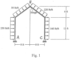 【已刪除】1. A gable frame is subjected to a wind loading,as shown in Fig. 1. Determine the reactions at its supports due to the loading. (25%)