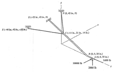 【已刪除】2. The landing gear shown in Fig. 2 consists of the bent member ABCD and the two supports CE and CF, which are two force members. Points D, E, and F connect to the fuselage. Point A receives the loads from the wheel. The connection at D can resist forces in all directions but only a torsion about BCD axis. Neglect the weight of the landing gear,calculate the forces in members CE and CF,Nqe and Ncv . (25%)