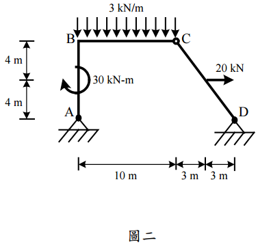 【已刪除】二、有一構架如圖二所示,C 點為鉸接,試繪其彎矩圖及剪力圖。(30 分)