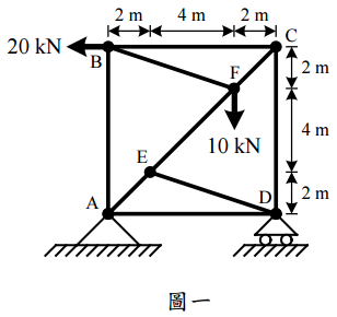 【已刪除】一、有一桁架如圖一所示,試求 AD、BF、EF 桿之桿力。(20 分)