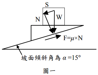 【已刪除】一、山坡地住宅社區之安全,因國道三號高速公路山崩滑動引起國人重視。若某山坡地 住宅社區坐落於砂岩與頁岩互層之順向坡上(如圖一所示),坡面傾斜角為α=15°, 若滑動之安全係數 F.S=1.5,請問砂岩與頁岩互層間摩擦角ψ最小為若干角度時,該 山坡地住宅社區可維持平衡?假設該山坡地住宅社區之區塊總重量為 W,坡面傾斜 角之下滑分力為 S,坡面傾斜角上之阻抗力為 F=μ×N,μ為摩擦係數,其值等於 tan(ψ),N 為垂直於坡面之分力。(20 分)