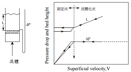【已刪除】⑴對於流體流過粒子床,典型之壓降(pressure drop)∆P 及床高(height)L 與流體 空床流速(superficial velocity)V 之關係常如下圖所示,於固定床階段,床高不 變而壓降隨流速提高而增大,而於流體化階段則床高隨流速增大而膨脹但壓降不 變,試說明造成此現象之機制。