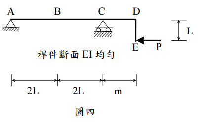 【已刪除】四、設有如圖四所示斷面均勻之桿件 ABCDE,B 點為 A、C 二點之中點。E 點受水平力 P 作用,試求當 B 點之垂直變位絕對值(|δ