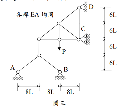 【已刪除】三、設有如圖三所示由均勻斷面桿件構成之結構,桿件交接處均為鉸接。不必考慮桿件 挫曲問題,試求支承處之反力。(20 分)