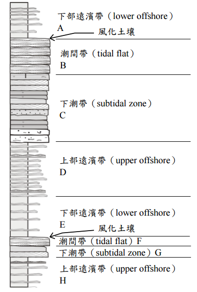 【已刪除】三、請由圖示的地層柱的沉積環境建立一個地層層序,並說明層序界線、低水位體系域、 海進體系域、高水位體系域的位置;並說明此層序的環境變遷。(大寫英文代表不同 的沉積環境帶,說明層序界線與體系域位置時,以大寫英文來表示)(25 分)