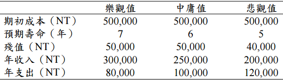 【已刪除】四、國內某企業欲至東南亞進行投資,其分別以樂觀、中庸與悲觀三種方式估出之成本 與預估收入如下所示: